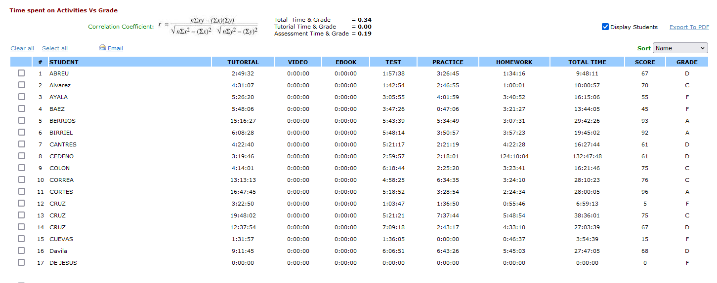 - Columns: The report presents data in a tabular format with columns for each activity, total time spent, scores, and grades.