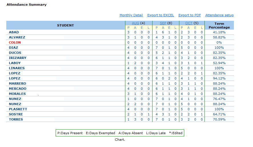 Attendance Summary Report is a tool that provides a comprehensive overview of student attendance in a term. The image below shows the attendance across three months: August, September and October. For each student, the report details the number of days present (P), days exempted (E), days absent (A), and days late (L). Additionally, a term percentage is calculated to reflect the overall attendance rate for each student.