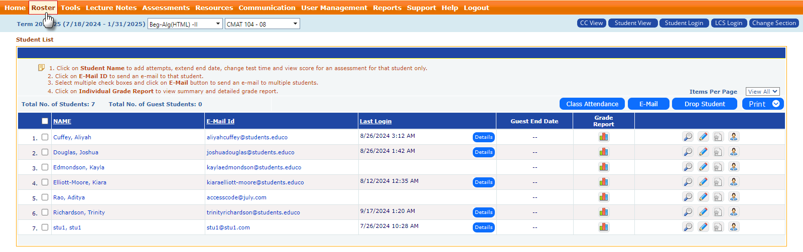 On the roster page, the instructor can take class attendance, email students, and remove students from the course, among other options.