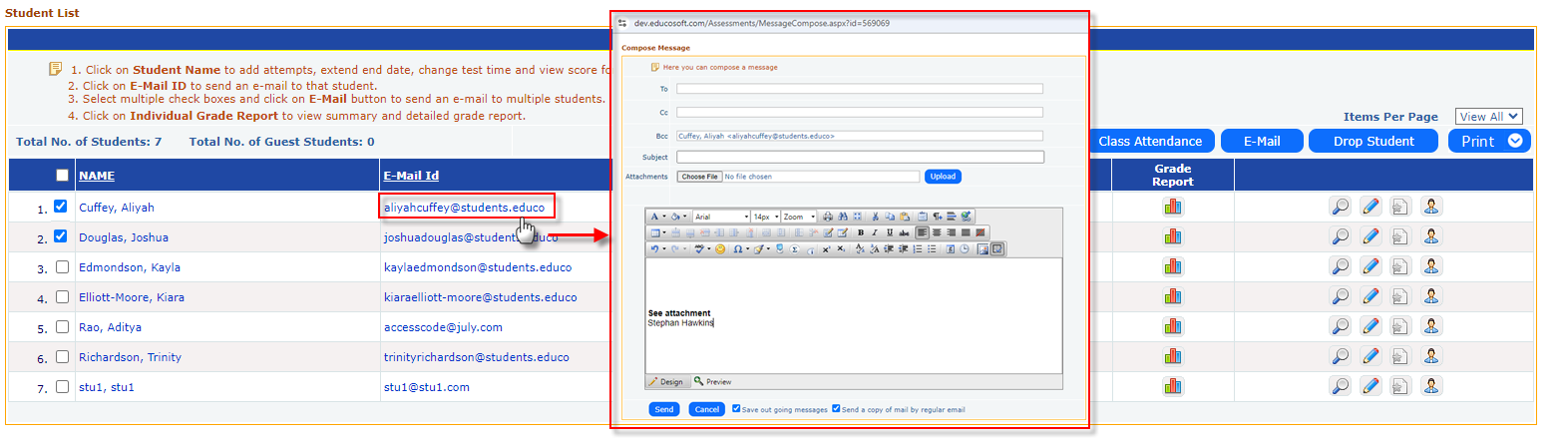 - Click on the corresponding student's email address to send an email to that student OR select multiple check boxes and click the "E-Mail" button to send emails to multiple students.