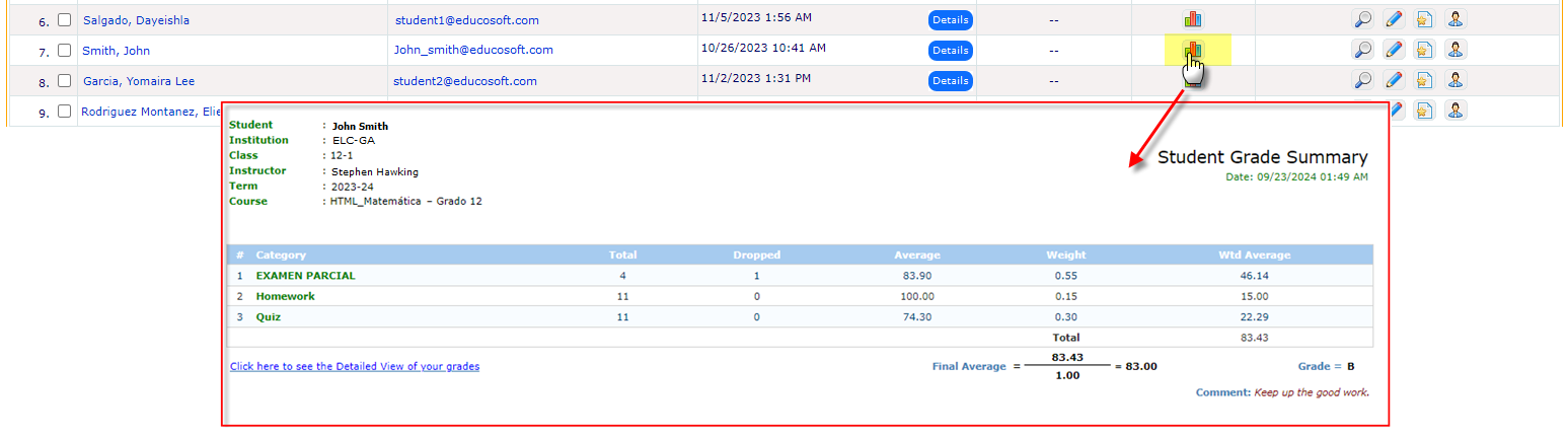 - Click on "Individual Grade Report" to view a summary and detailed grade report.