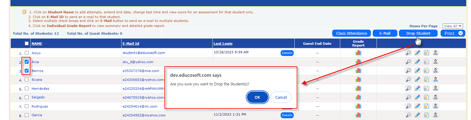 - Select the student(s) and then click on the "Drop Student" button to remove them from the class.