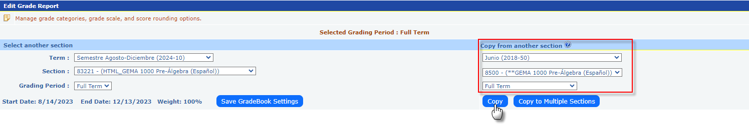 The Copy feature enables instructors to replicate Grade Book settings across multiple sections or terms. This saves time and ensures consistency in grading criteria across courses.