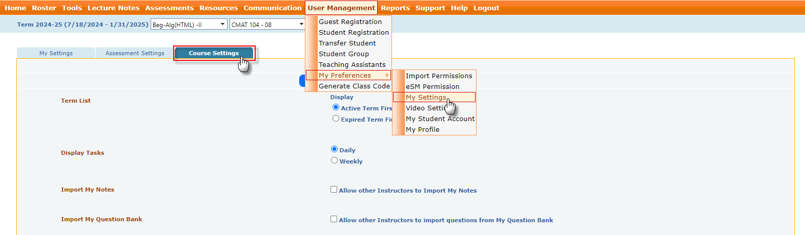 - Term List (Display Options): Display active or expired terms first on the instructor's home screen, providing customizable viewing preferences.