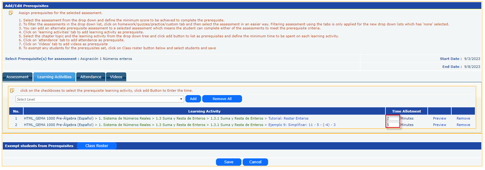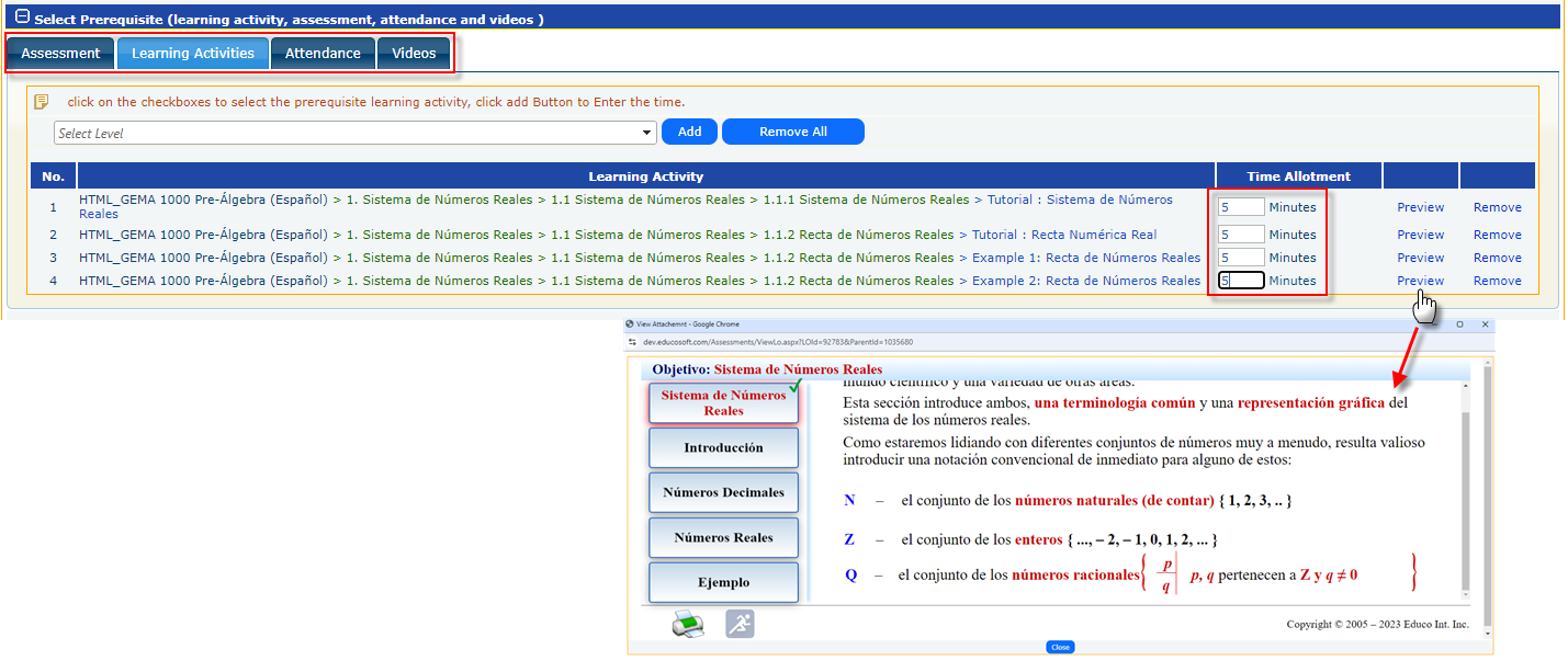 - Assign Pre-requisites: Learning Activities, Assessment, Attendance or Video for the assessments by clicking “+” sign.