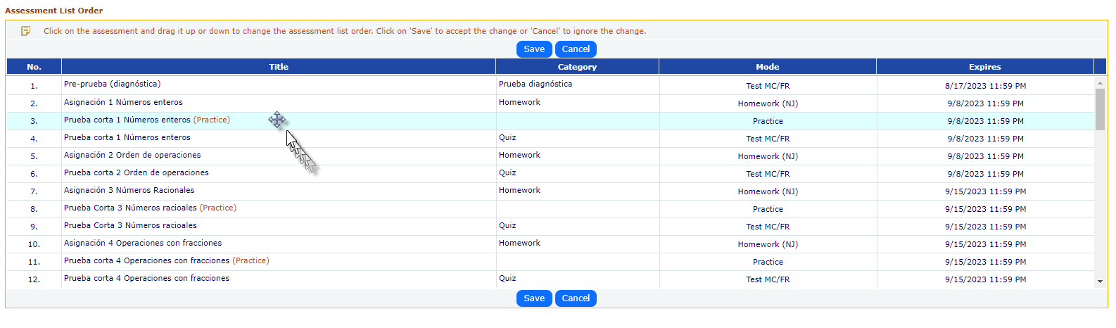 This page lists all the assessments created or imported for the course section.