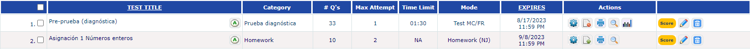 - The list contains all the information about the listed assessment including: Title, Category defined in the gradebook, Number of questions, Max Attempts, Time assigned, Test Mode, Expiry date, Links to edit assessment settings, add/edit the pre-requisites, option to print and to preview the assessment as delivered to the students.