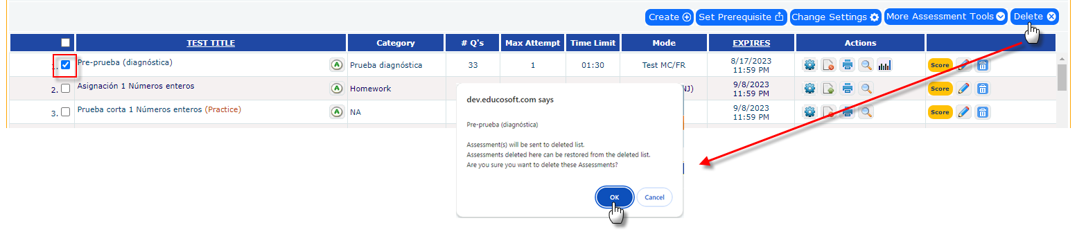 - Click on the button to delete the selected assessment.