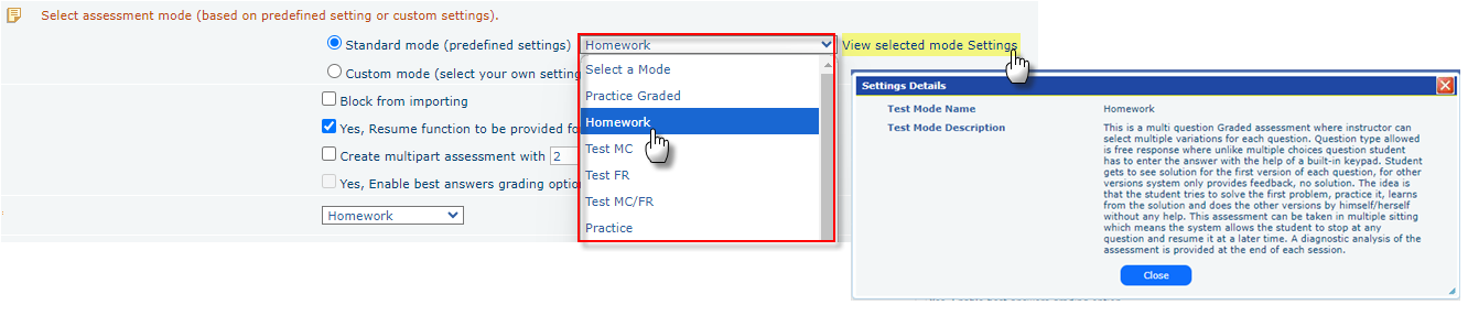 - Select Mode: Select Homework to create a homework or Test MC/FR to create a test.
