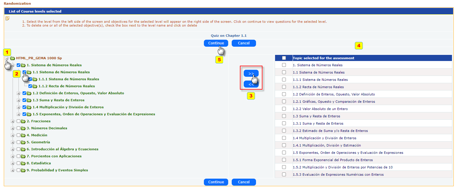 After clicking on the Continue link from the above screen, the TOC of the course is displayed to select chapters or topics to be covered in the assessment.