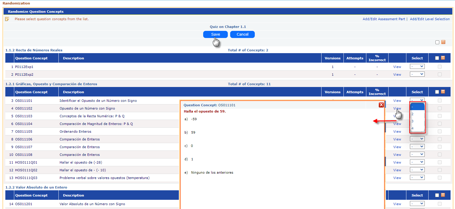 - Select the number of variations of the question you want in the Homework. This option is available only for Homework mode. In this mode, instructor has to select at least two variations. In case of Test select the questions rather than selecting variations. After selecting the questions, Click on the Save button to view the added questions.