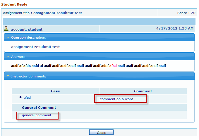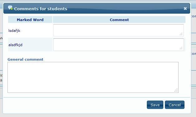 button to add comments on student’s response or select a word in the answer click on highlight button and then click Add Comments icon to add comments for highlighted words correspondingly or a general comment too in the popup.