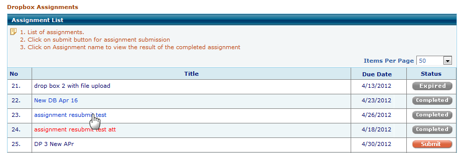 - Assignment in blue are evaluated and on click of the Assignment Title to see the details.