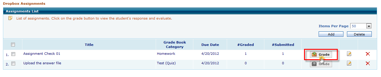From the Dropbox Assignment listing page click on ‘Grade’ button corresponding to the Assignment title.
