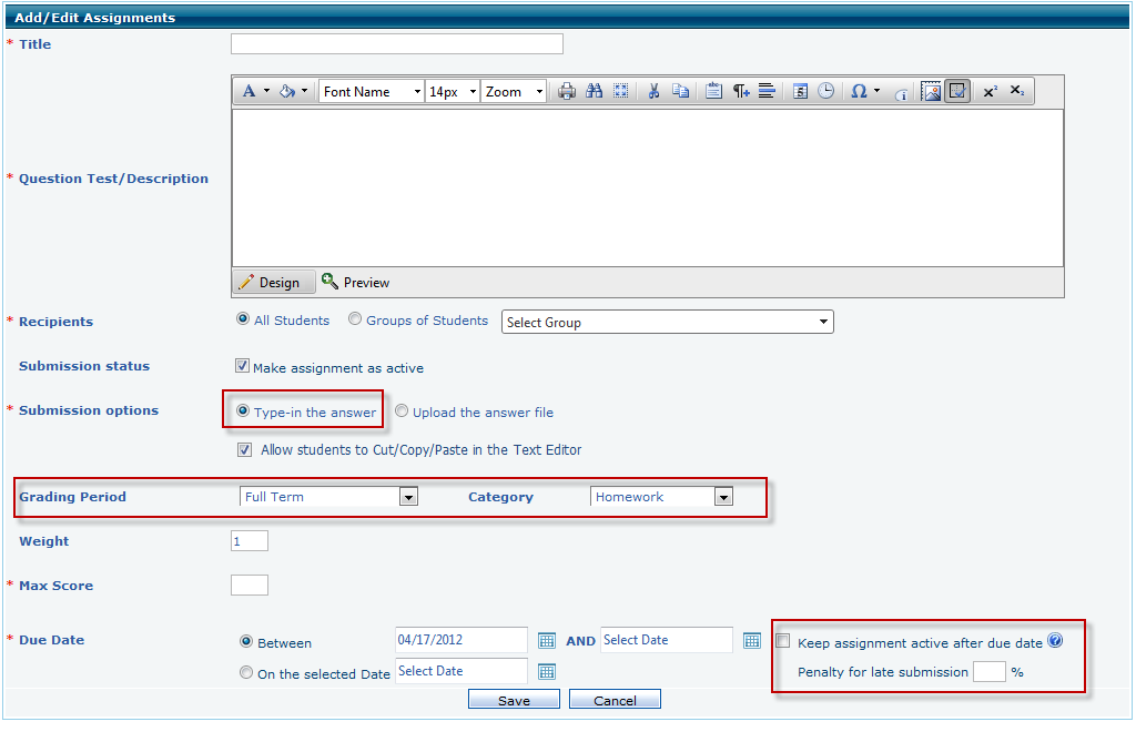- User can keep the assignment active even after due date with a penalty in score, check the option “keep assignment active after due date” and enter the %score to be penalized for late submission on the evaluated total score for assignment.