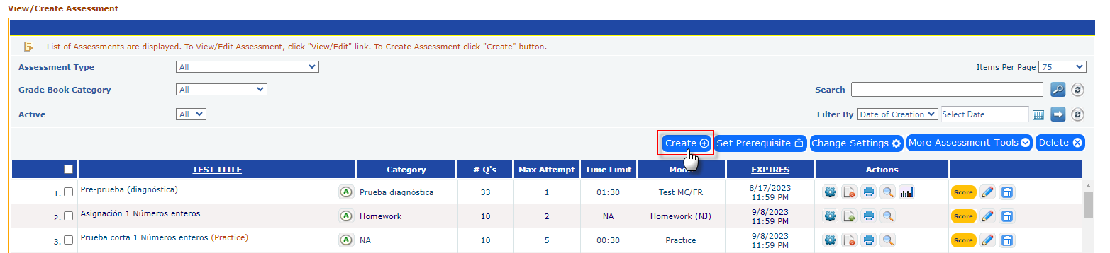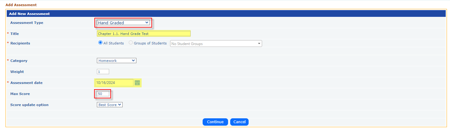 If you prefer to enter the scores later, simply click the Save button after creating the assessment title without entering any scores. This will add the hand-graded assessment title to your assessment list. Whenever you're ready to enter scores, click the Score button, input the scores as described above, and save.