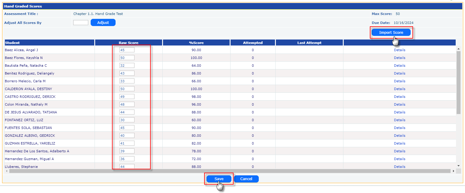 If you have the scores ready, enter the raw score for each student based on the max marks defined earlier, and click the Save button after entering all scores.