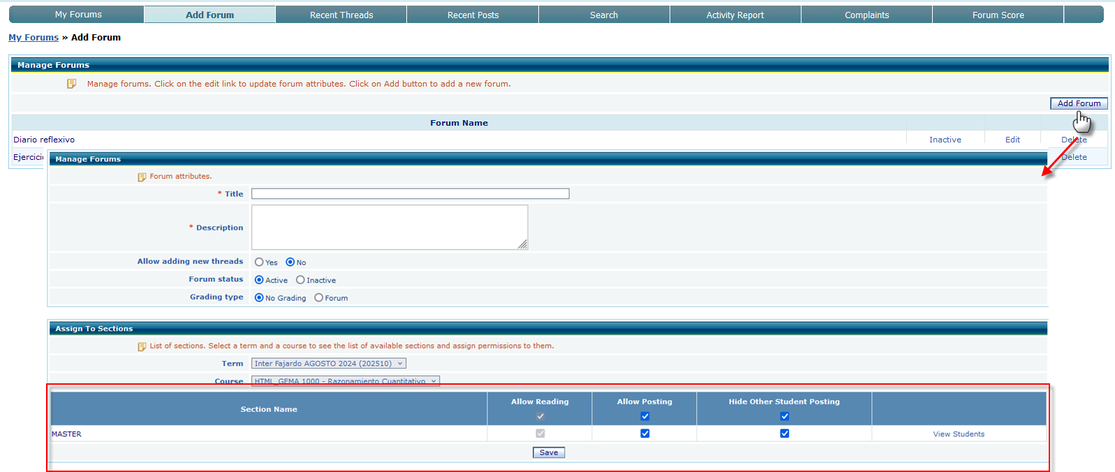 - Add Forum: Instructors or administrators can create new forums by clicking the "Add Forum" button. They need to provide a name, description, and specify the course, term, and section(s) the forum will be associated with.