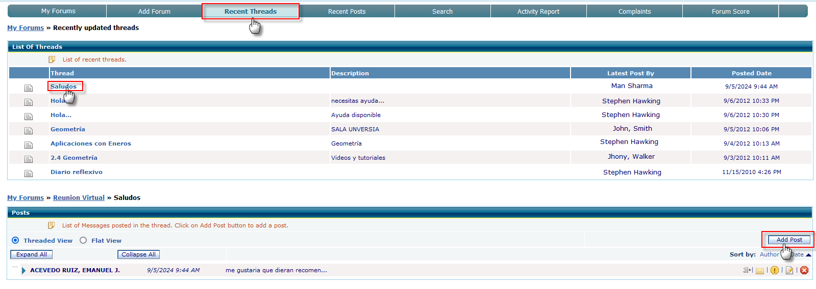 - Forum List: Displays a list of available forums. Users can click on the forum name to see the list of threads within that forum.