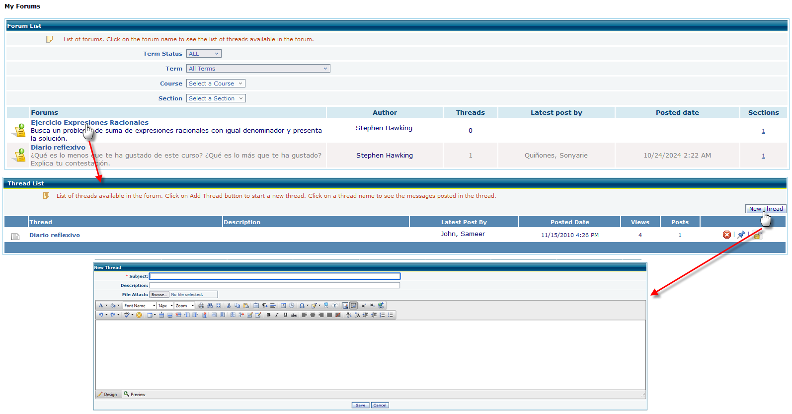 - Filter Options: Users can filter forums by term, course, and section to find relevant discussions quickly.
