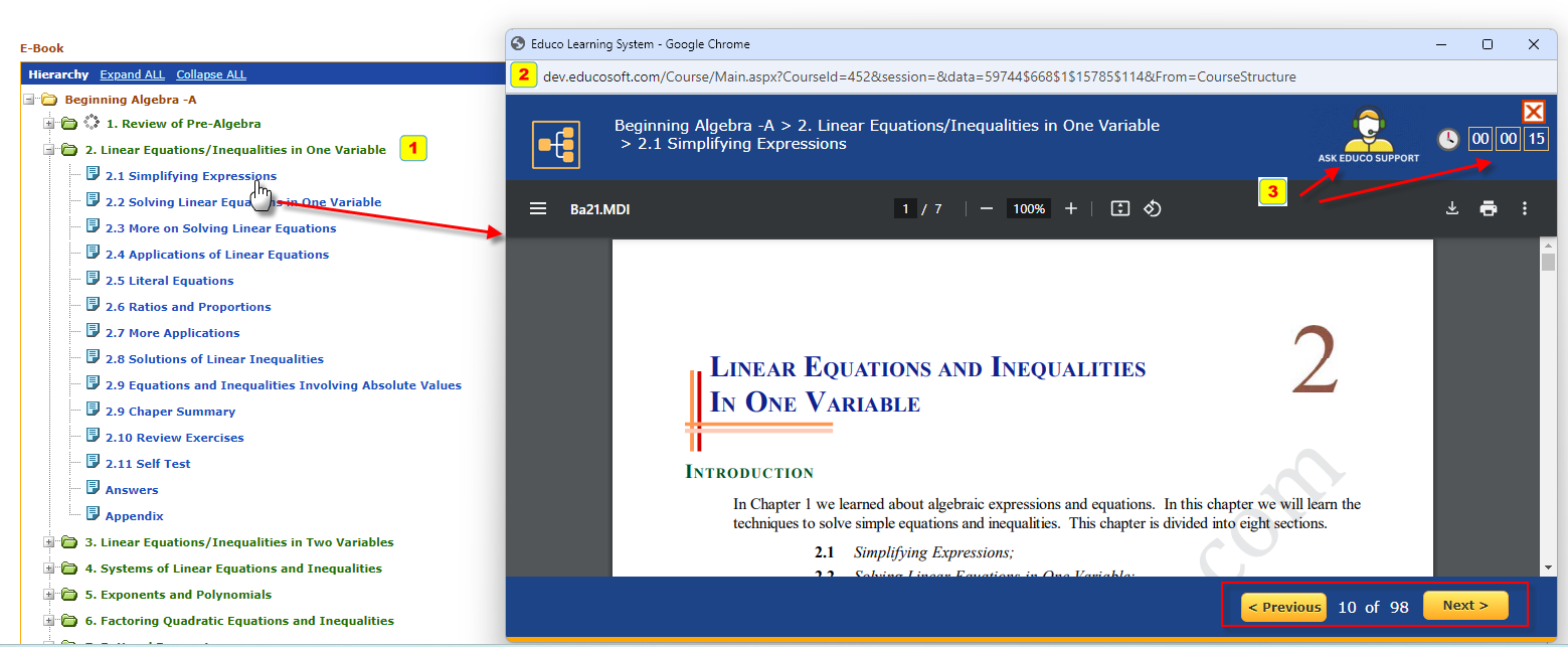 - Time Tracking: A visible timer tracks how long the student has been viewing the e-book, for timed reading or session tracking.