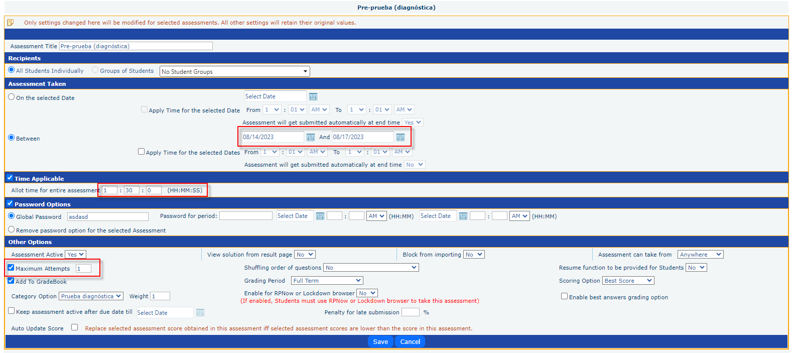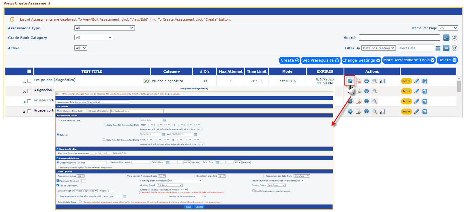 - For a Single Assessment: Click the settings button next to the assessment to modify its date and other settings.