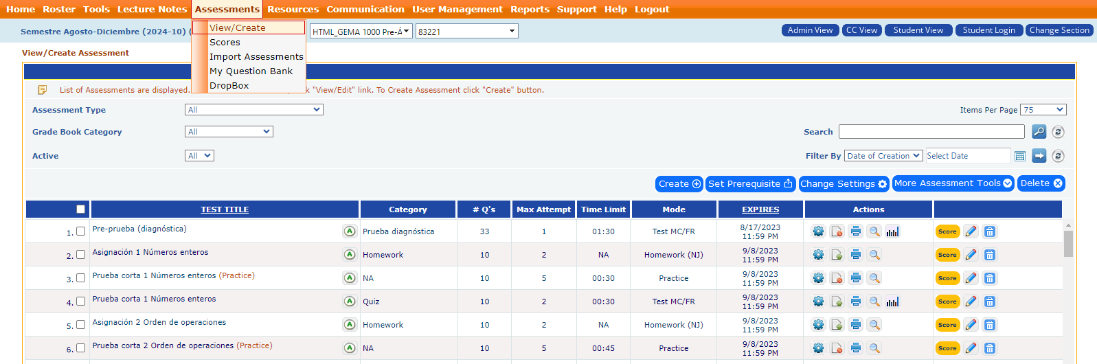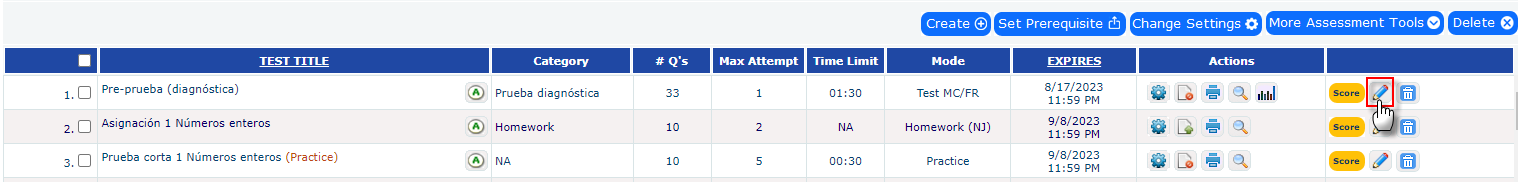 Editing Assessment Setting(s), Extending Dates, Adding Attempt, and Editing Test Items