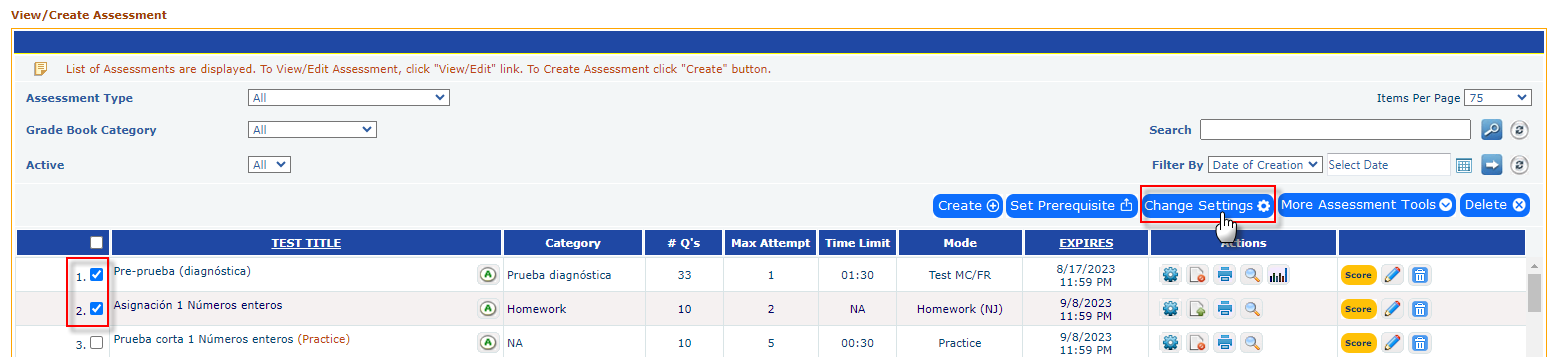 - For Multiple Assessments: Select the checkboxes for the desired assessments and click the settings button.