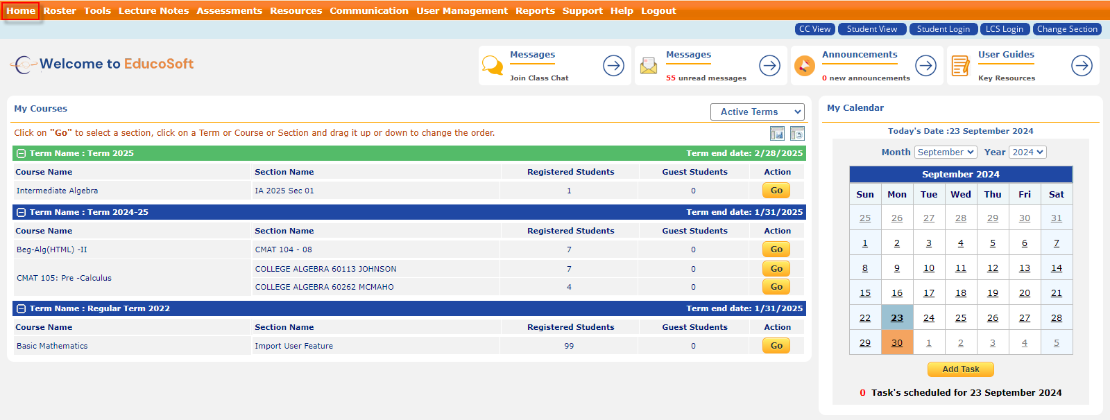 - For each course, the dashboard provides details about section name, number of registered students, guest students, and an "Action" column with a "Go" button to access course details.
