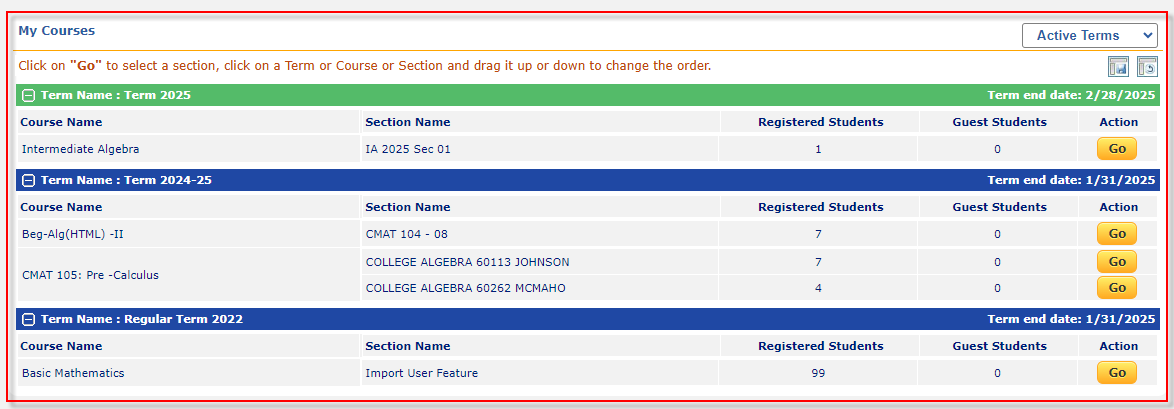 - Active/Expired Term Filter: In the "My Courses" section, there is an Active Terms dropdown filter, allowing the instructor to switch between active and expired terms for better course management.