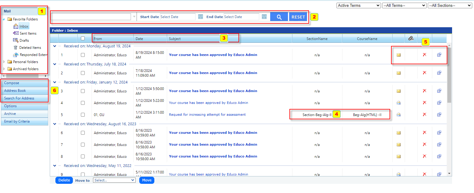 Dropdown Filters for Active Terms, Terms, and Sections, making it easier to find relevant communication based on course or semester.