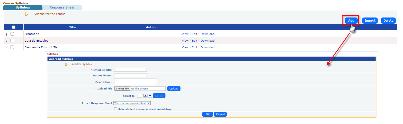 - Add Button: Instructors can upload new syllabus-related documents directly into the system using the "Add" button. This allows them to include course outlines, guidelines, and other important materials.