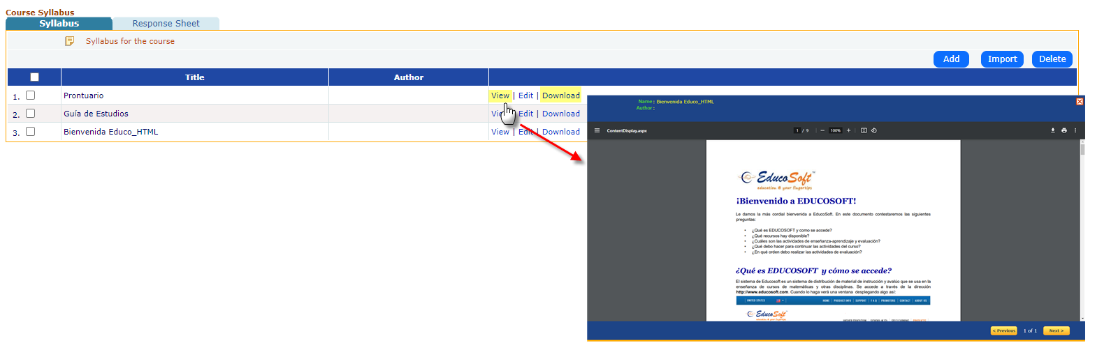 - View: Both instructors and students can view syllabus documents directly within the EducoSoft system, making it easy to access materials without the need for separate downloads.