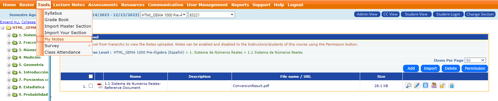- From the Tools dropdown menu, select My Notes to view, add, or import notes associated with the course.