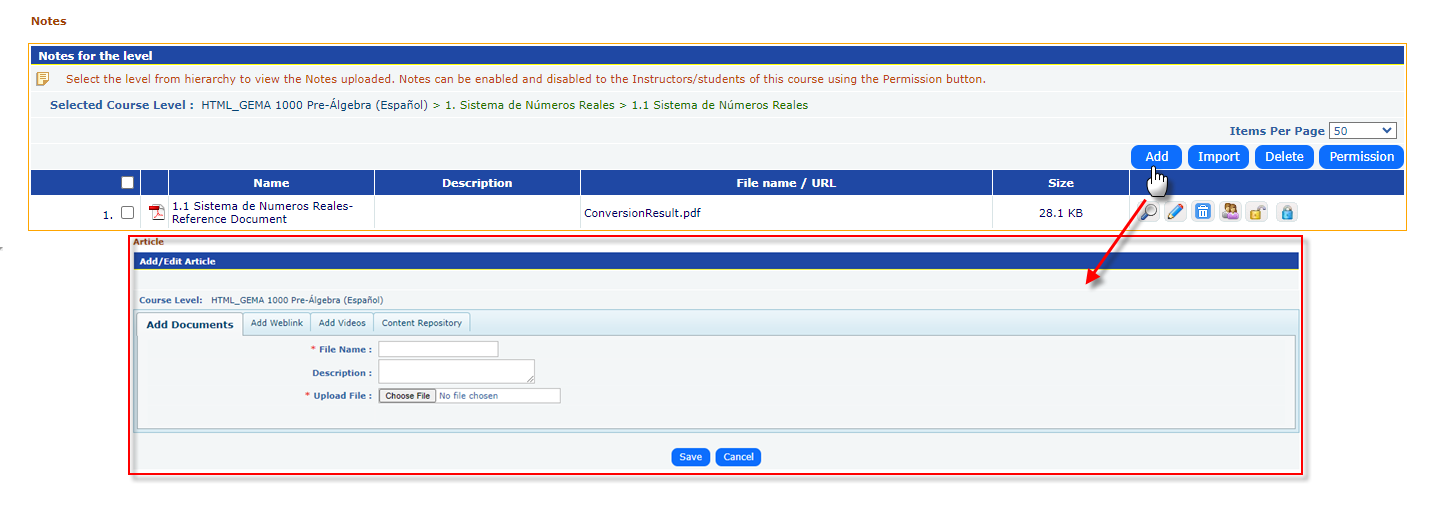 - Supplement Documents: You can add supplementary documents to specific levels of the course hierarchy. Simply select the level from the hierarchy where you want to upload the file and click Add. The file will be displayed next to the selected level in the course structure, making it easy for students or instructors to identify its relevance.