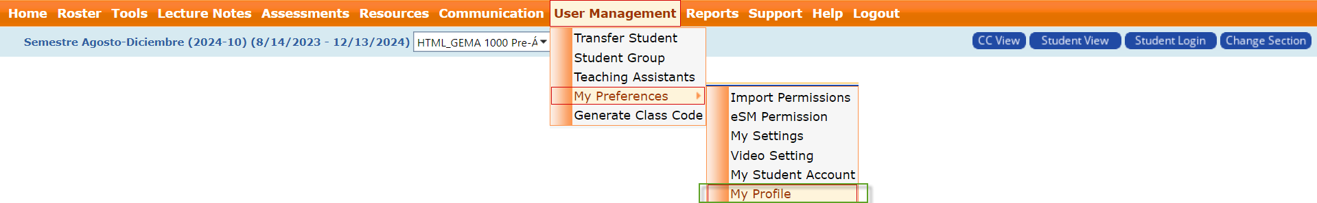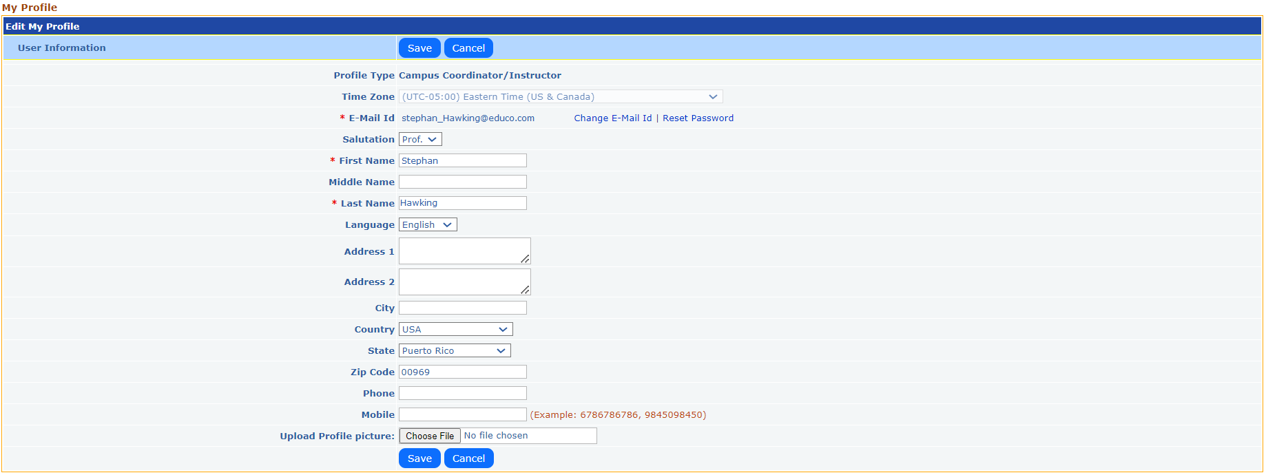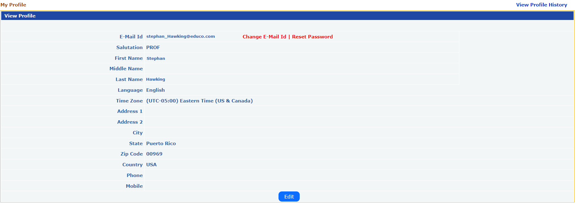 - Edit Profile: Click on the ‘Edit’ button to change Instructor Information.