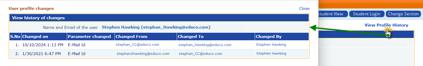 - View Profile History: Click on the ‘View Profile History’ link to view the instructor profile history changes.