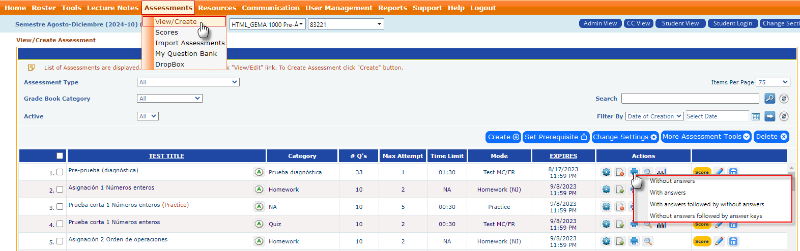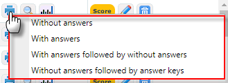 - Click the print button for the specific assessment you wish to print. A popup menu will appear—showing the following options