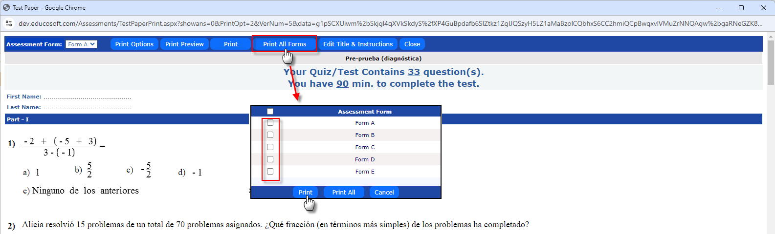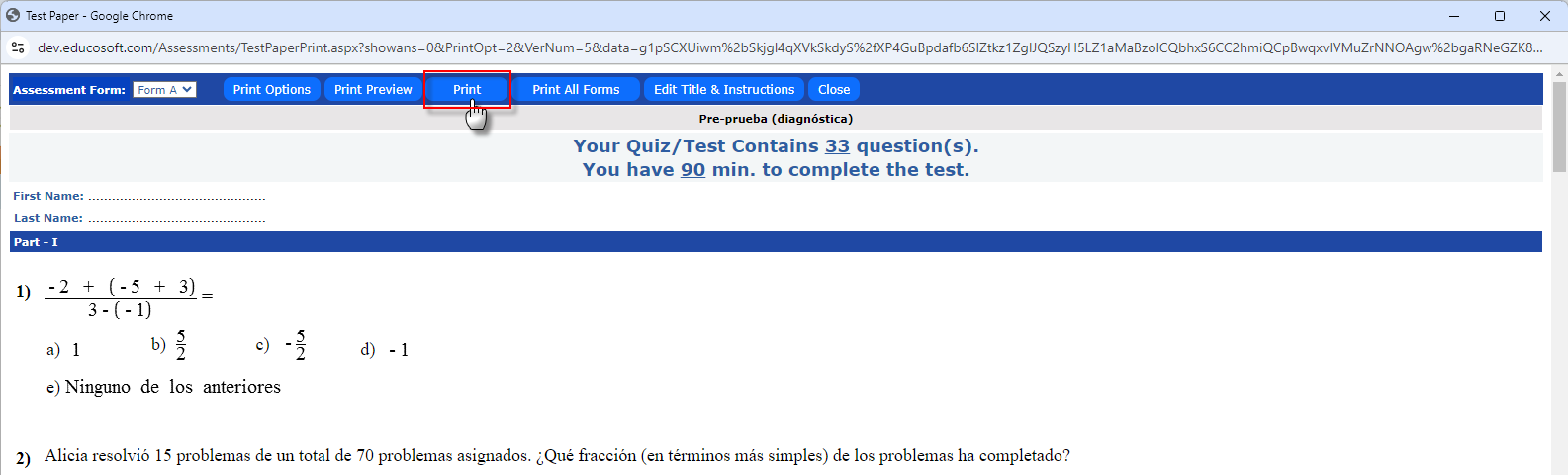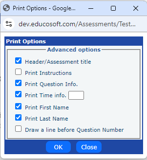 - Customize Print Options: Click on the Print Option button for advanced settings, which will be displayed at the top of the test.