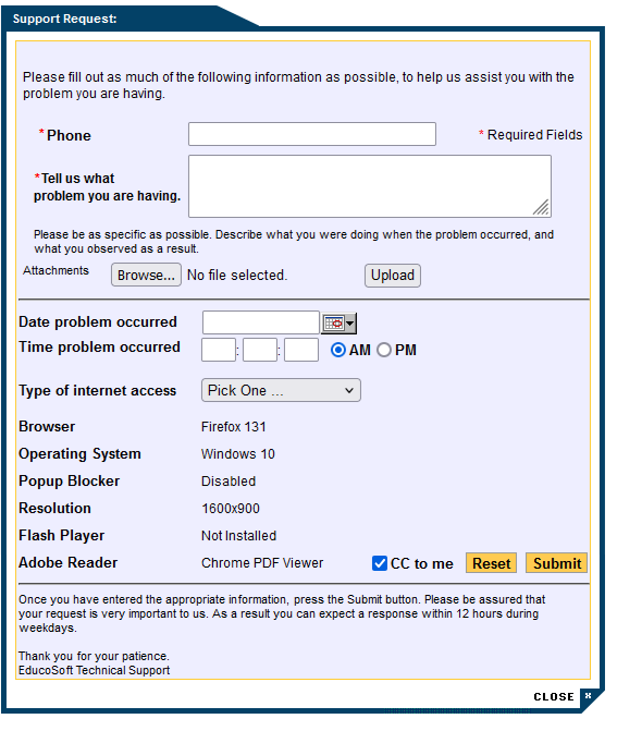 - User System Information: Pre-filled information about the browser used, Operating System used, popup blocker status, and the screen resolutions are retrieved automatically.