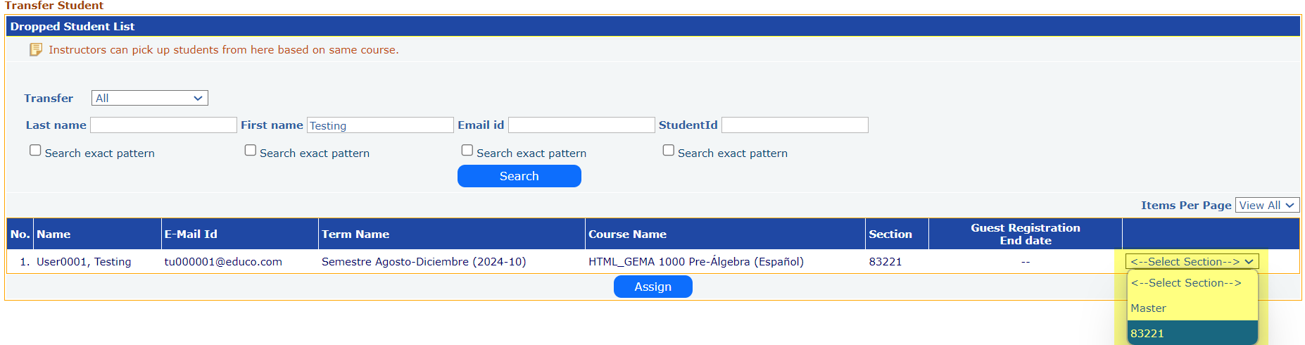Alternatively, the instructor can search for the Active/Dropped students under “All” users, type some information of the student(s)s to be reassigned (transferred) to a different section.