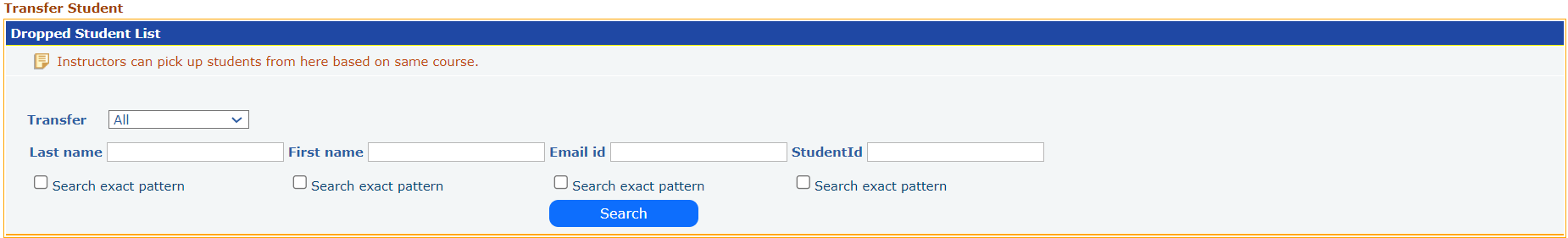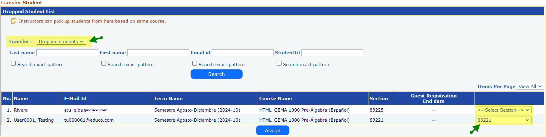 This feature allows instructor to search Active and Dropped students and those students can be assigned to other section of the same course assigned to the same instructor.