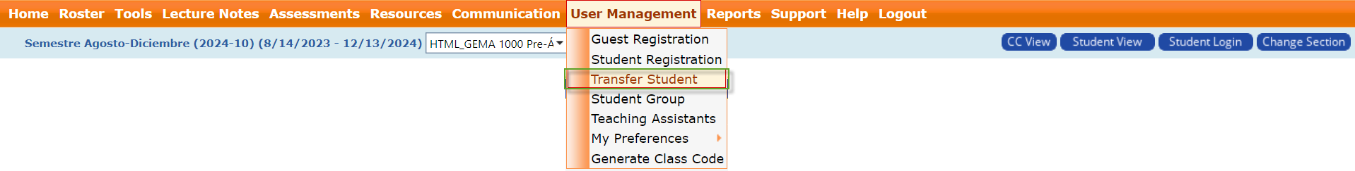- Go to User Management > Transfer Student.