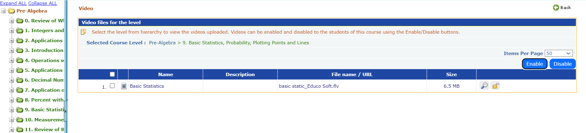 - Click on the ‘Details’ link to see the videos for each level in the course and to enable/disable them individually.