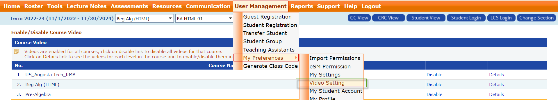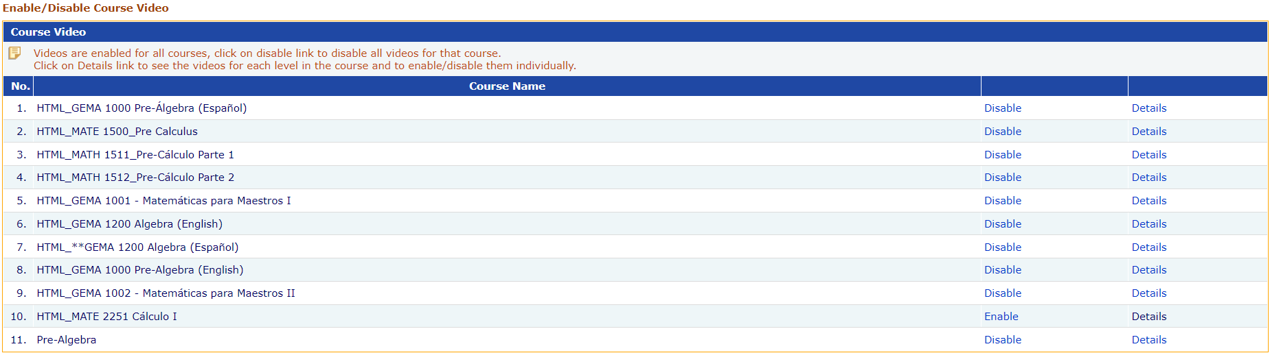 - Click on the 'Disable' link for a specific course to turn off all videos in that course for the students.
