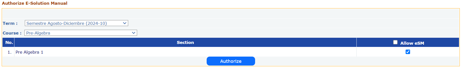 - Select the term and course from the drop-down list. Then, select the section(s) and click the 'Authorize' button to save the settings for authorizing the E-Solution Manual for the selected section/course.
