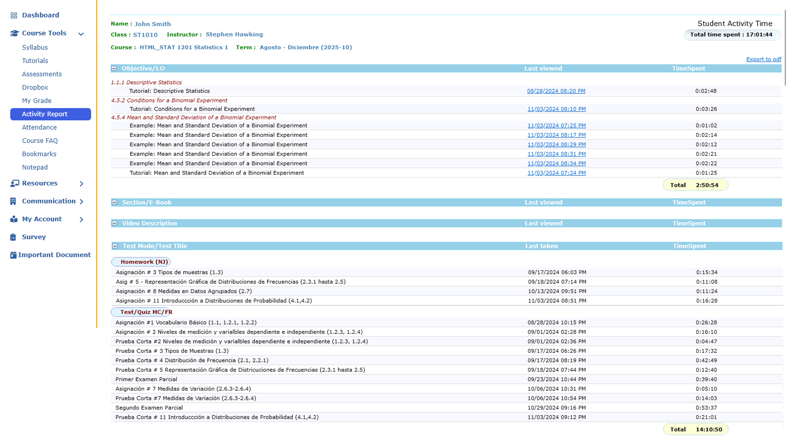 - Activity Categories: The report is divided into sections, often including different types of activities such as tutorials, assignments, and quizzes.