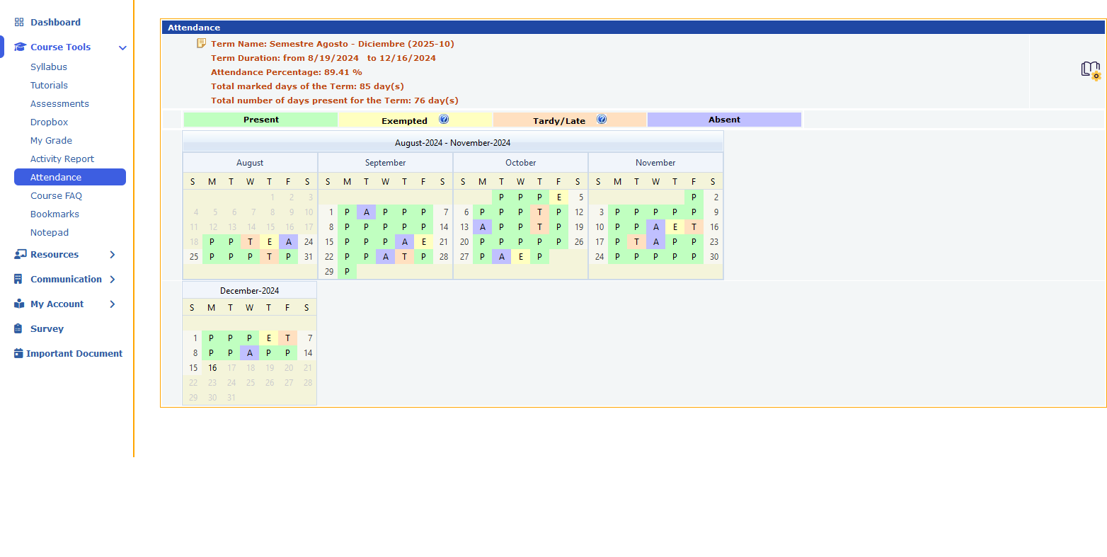 - At the top, students can see the name of the term, its duration, their attendance percentage, the total marked days, and the total number of days they were present.