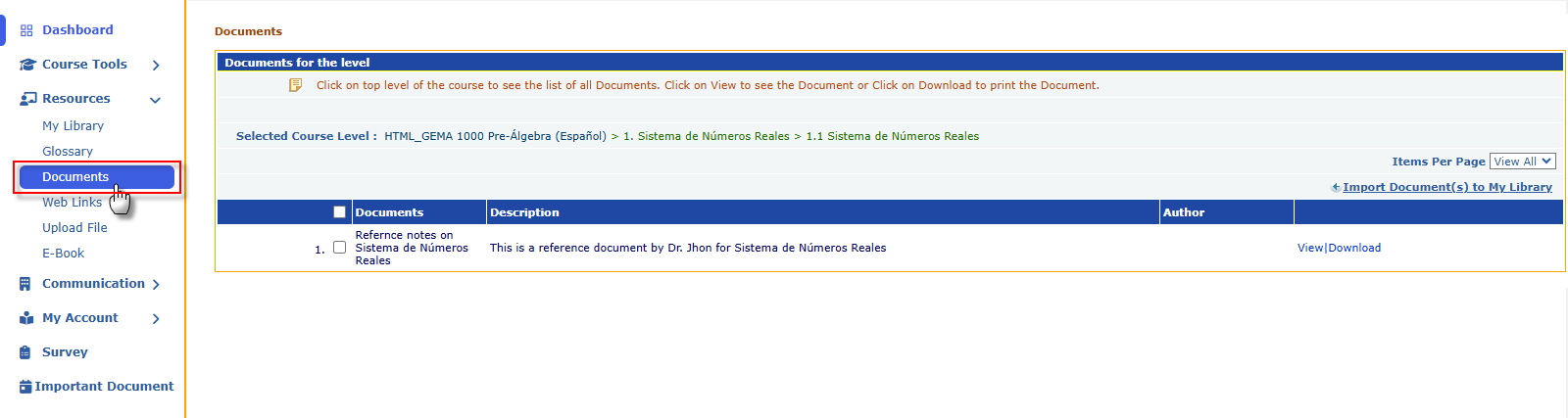 - Import Documents: Students can import specific documents into their personal library (My Library), allowing for better organization and accessibility.