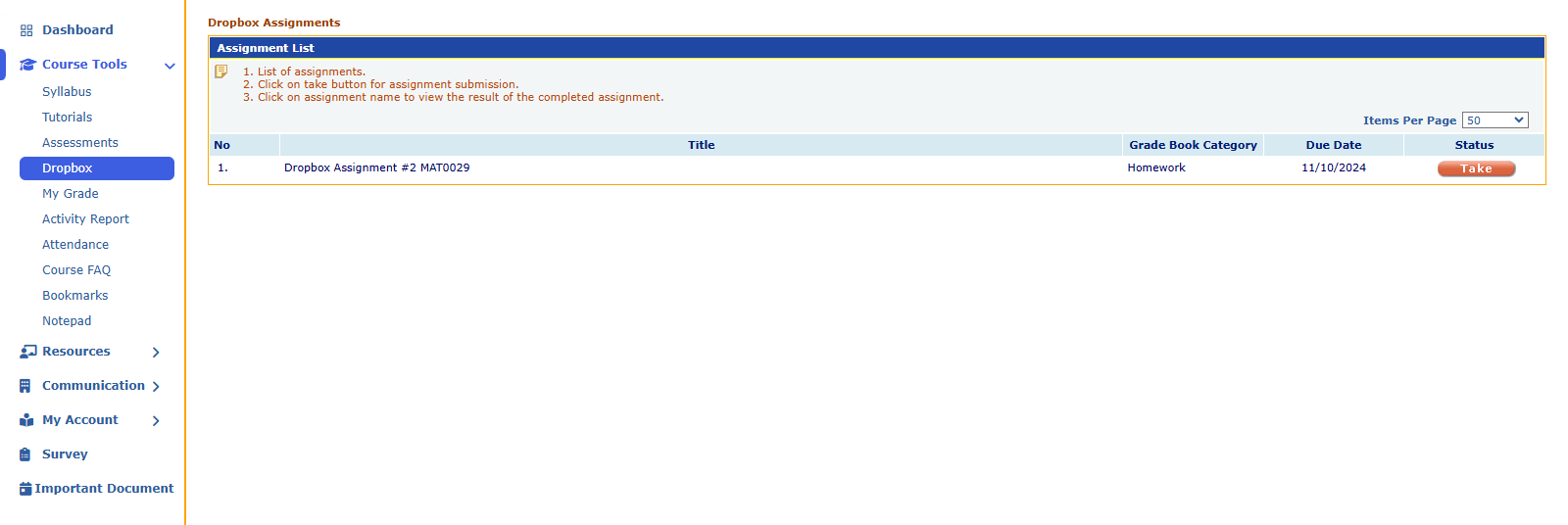 - Accessing Assignments: Students see a list of available assignments in the Dropbox, showing details like the title, due date, and category (e.g., Homework).
